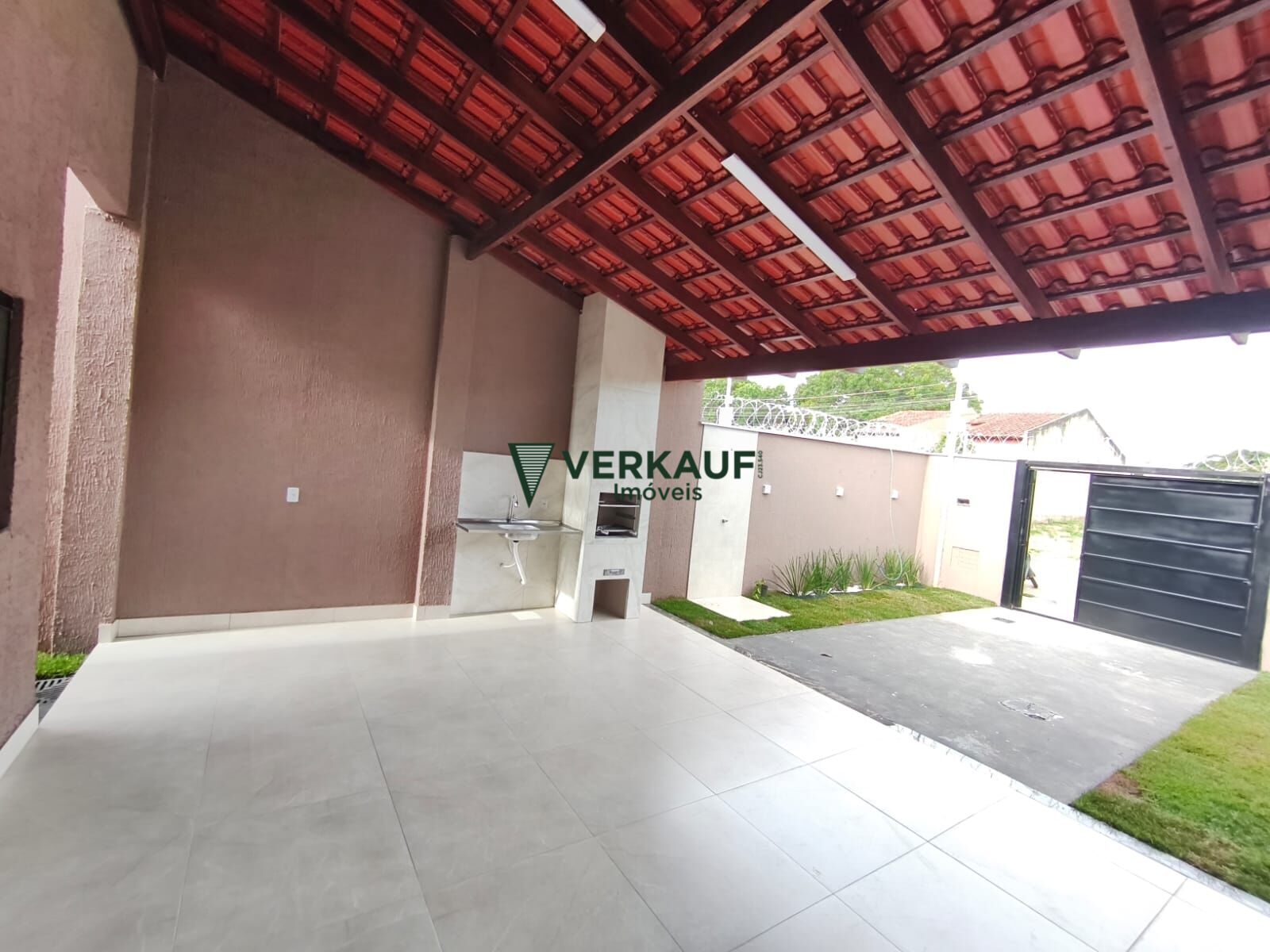 Casa 02 quartos, sala de estar/jantar, cozinha americana, banheiro social, hall de circulação, varanda gourmet com churrasqueira, 02 vagas de garagem coberta, 02 vagas de garagem descoberta, corredor lateral, área de serviço, quinta.
