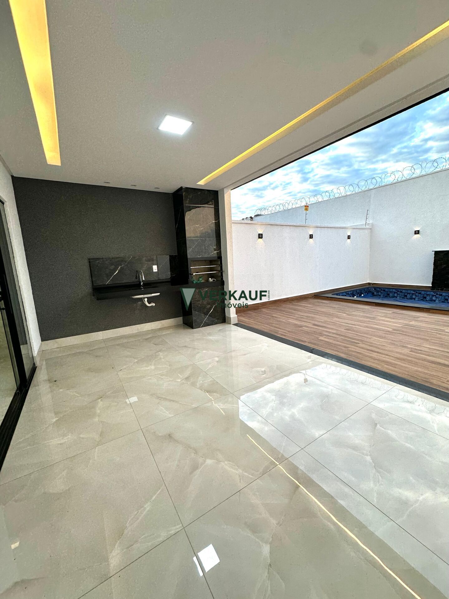 • Piscina em alvenaria com cascata, hidro, iluminação em LED e aquecimento solar